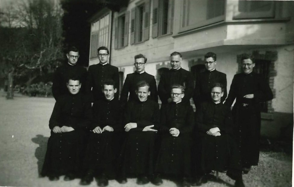 Das Noviziatsjahr 1961–1962. Kniend vordere Reihe von links: Hans Widmer, Alois Lang, Bernhard Hausherr, Viktor Camenzind, Josef Eugster und Engelbert Schuwey. Stehend hintere Reihe von links: Klaus Wildisen, Urs Bärlocher, Marius Andrey, Markus
