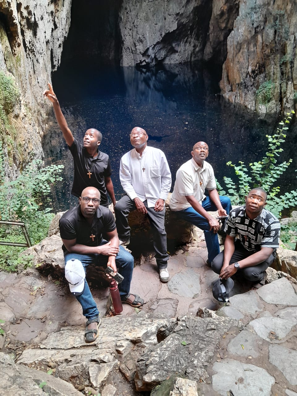 Die Novizen besuchen im 2024 mit Mathew die Chinhoyi-Höhlen. Von links: Reuben Chege, Peter Muturi Kamau, Mathew Madziva, Jackson Mutua und Lovemore Japi.