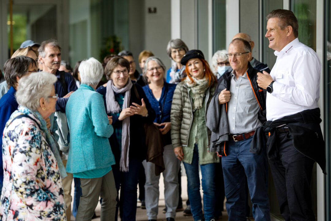 Patrice Riedo (links) erklärt Teilnehmerinnen und Teilnehmern des Architekturspaziergangs in Immensee im