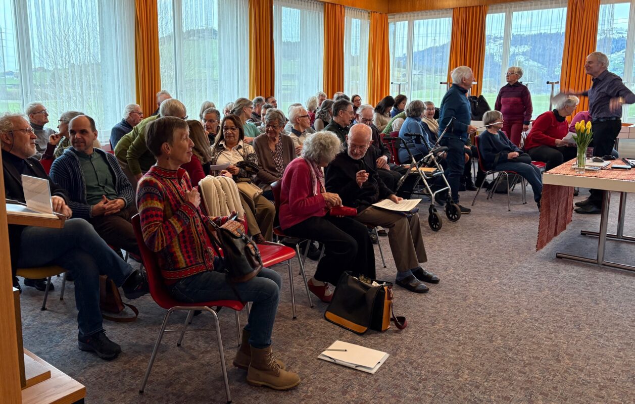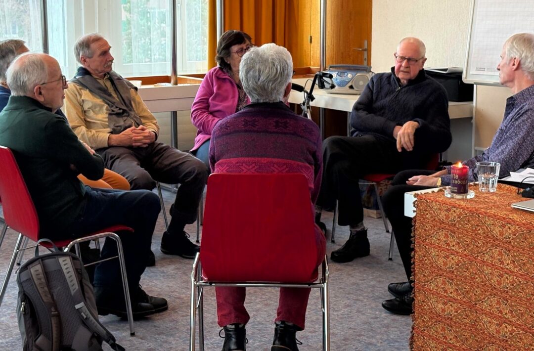 Die vorgegebene Dynamik für die Gruppen gefiel mir sehr: 1) Ankommen, das eigene Innere öffnen und bereit werden, zuzuhören. Nacheinander kann jede Person ihre Gedanken äussern – ohne Unterbrechung, Diskussion oder Rückfragen. Die Stille hilft, das Gehörte nachklingen zu lassen und Resonanz zu spüren: Was hat mich berührt, ist mir wichtig? – Dann 15 Minuten Pause und anschliessend 2) Resonanz gemeinsam: Was hat mich im Gehörten bewegt, wo sehe ich Verbindungen oder vielleicht auch Fremdes? Keine Diskussion – im Sinne des hörenden Sprechens. Keine Bewertung, aber Resonanz im Inneren suchen: Was berührt mich, ist mir wichtig? – Danach käme noch die gemeinsame Klärung. Dafür reichte uns die Zeit nicht. Es geht nicht darum, Konsens zu suchen, sondern darum, gemeinsam zu unterscheiden: Wo zeigen sich geteilte Ansichten? Wo sehen wir fruchtbar werden könnende Spannungen? Was könnte ein nächster Schritt sein?