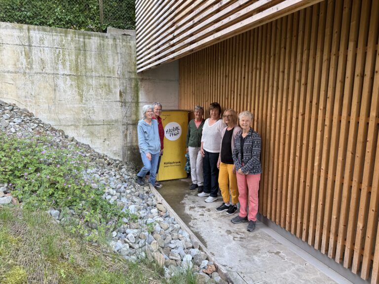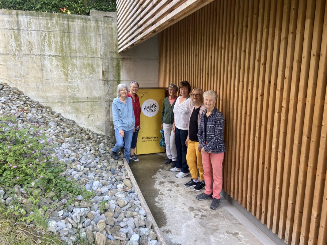 Die freiwilligen Helferinnen stellen sicher, dass der Kühlschrank in der Wohnsiedlung einwandfrei funktioniert. Von links: Anita, Annemarie, Hedi, Hildegard, Sonja und Beatrice.