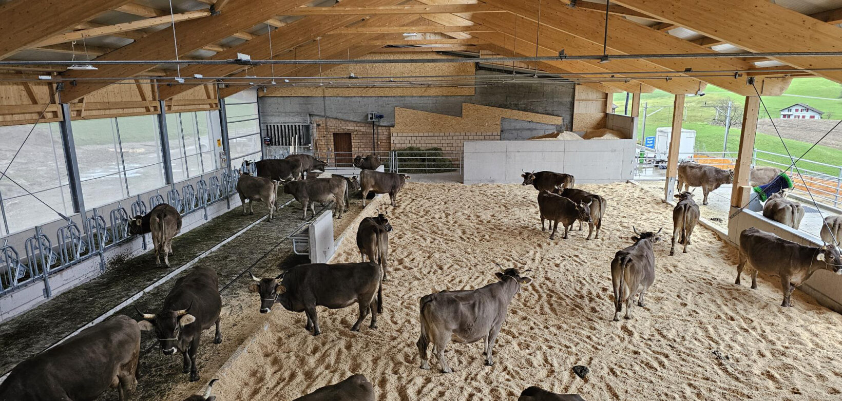 Der nachhaltige Kompost-Laufstall mit einer Gesamtliegefläche von 315 Quadratmetern wurde am 22. Dezember 2023 fertiggestellt. Der Laufstall bietet zehneinhalb Quadratmeter Liegefläche pro Kuh, fast dreimal mehr als von der Tierschutznorm verordnet.