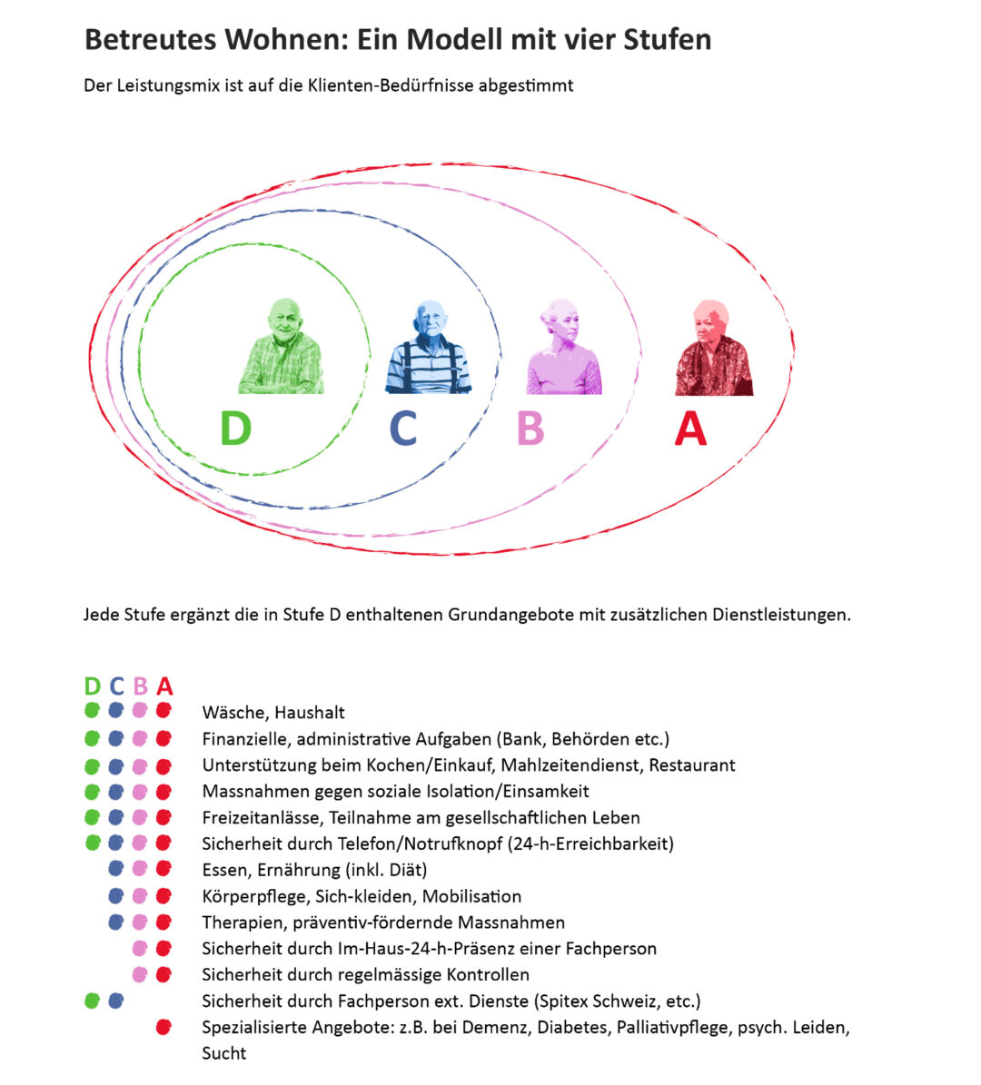 Eine Studie im Auftrag von CURAVIVA Schweiz, senesuisse, Pro Senectute Schweiz, Spitex Schweiz definiert betreutes Wohnen mittels eines Modells mit vier Stufen (A-D). Jede Stufe stellt eine Personengruppe mit ihren benötigten Unterstützungsmerkmalen dar.