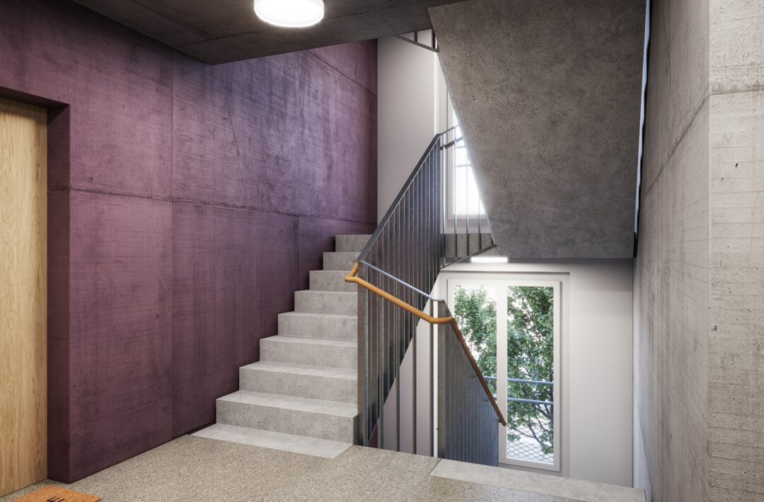 Visualisierung vom Treppenhaus in der zweiten Bauetappe.