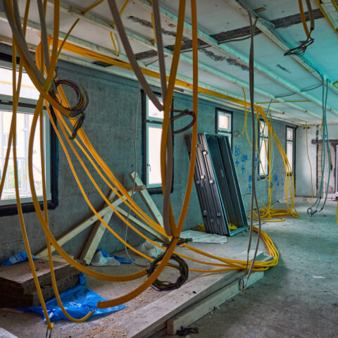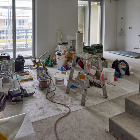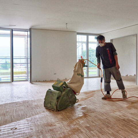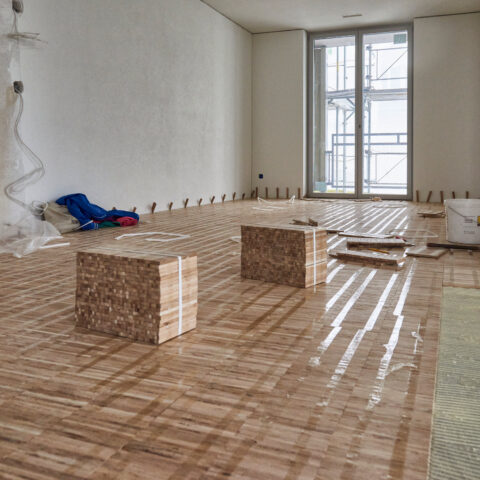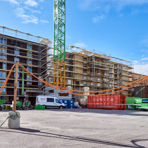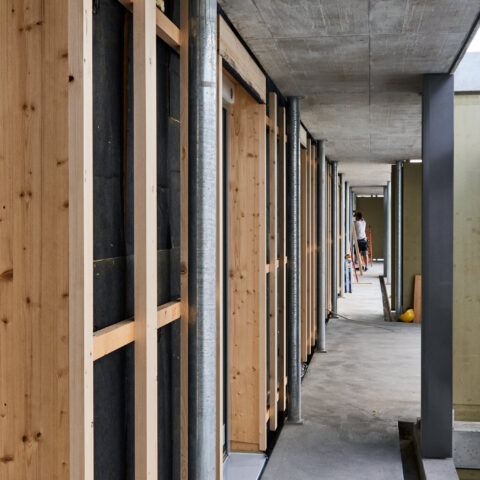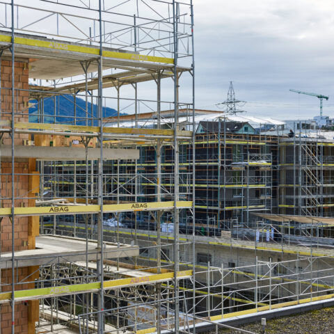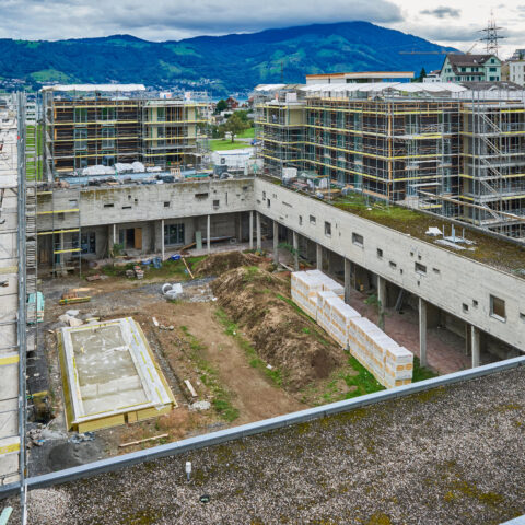 Gleichzeitig ist der Innenausbau der vier Gebäude schon in vollem Gange. Die Bauhülle erhält die Isolation und an einzelnen Stellen bereits die endgültige Fassade. Im Innern wird der gute Ausbaustandard bereits sichtbar.